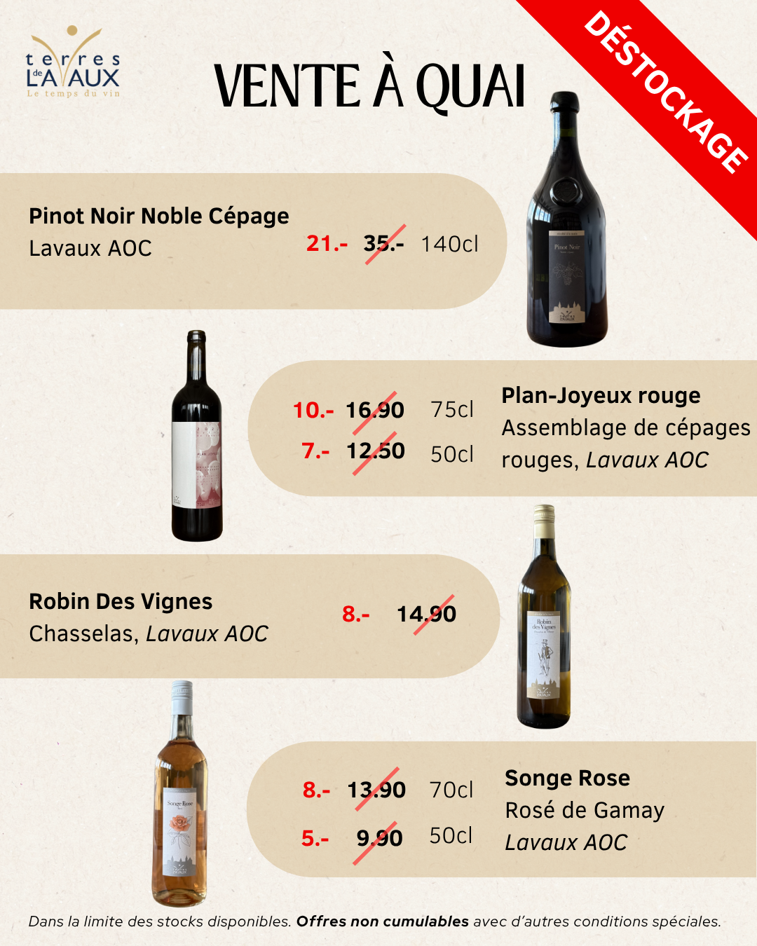 Avant de tourner définitivement cette page, nous serions ravis de vous retrouver lors de ces moments privilégiés : la vente à quai et vide-greniers le samedi 25 avril 2026, les Caves Ouvertes Vaudoises les samedi 23 et dimanche 24 mai 2026, et enfin la liquidation totale le lundi 25 mai 2026.