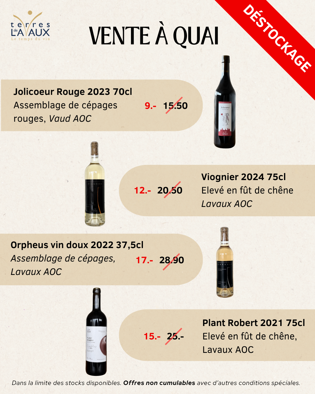Ne manquez pas nos offres exceptionnelles de déstockage, conçues pour vous faire plaisir à prix cassés ! Pour en profiter, c’est très simple : passez votre commande par e-mail à info@terresdelavaux.ch ou par téléphone au 021 791 24 66, avec paiement anticipé requis afin de bénéficier de ces prix particulièrement avantageux.